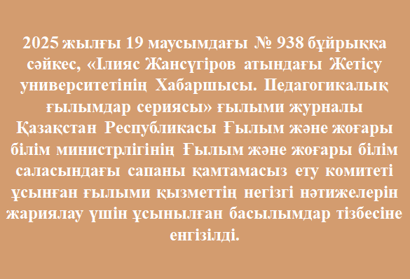 ІЛИЯС ЖАНСҮГІРОВ АТЫНДАҒЫ ЖЕТІСУ УНИВЕРСИТЕТІНІҢ ХАБАРШЫСЫ Журналдың ресми сайты: https://journal.zhetysu.edu.kz Бас редакторБурибаев Ермек АбильтаевичЖауапты хатшыОксикбаев Берикжан Кылышбекович«Педагогикалық ғылымдар» сериясы ISSN: 1813-1123Баспагер«І.Жансүгіров атындағы Жетісу университеті» ЖУРНАЛ ЕРЕЖЕСІ ЖУРНАЛ САЯСАТЫ ЖАРИЯЛАУ ЭТИКАСЫ ЖӘНЕ РЕЦЕНЗИЯЛАУ ЕРЕЖЕЛЕРІ РЕДАКЦИЯ АЛҚАСЫ РЕДАКЦИЯЛЫҚ САЯСАТ ҚАЙТА ТІРКЕУ КУӘЛІГІ МАТЕРИАЛДАРДЫ ЖІБЕРУ БАЙЛАНЫС МҰРАҒАТ Құрметті авторлар! №4 (117) «ЖУ Хабаршысы»журналына қолжазбалар 2025 жылдың 15 қарашаға дейін қабылданады. Ақпараттық хат ЖУ Хабаршысы №4 (117) ЖУРНАЛ ТУРАЛЫ МАҚСАТЫ, МІНДЕТТЕРІ ЖӘНЕ ТАҚЫРЫПТЫҚ БАҒЫТЫ ЖУРНАЛ МҰРАҒАТЫ ИНДЕКСТЕЛЕДІ: