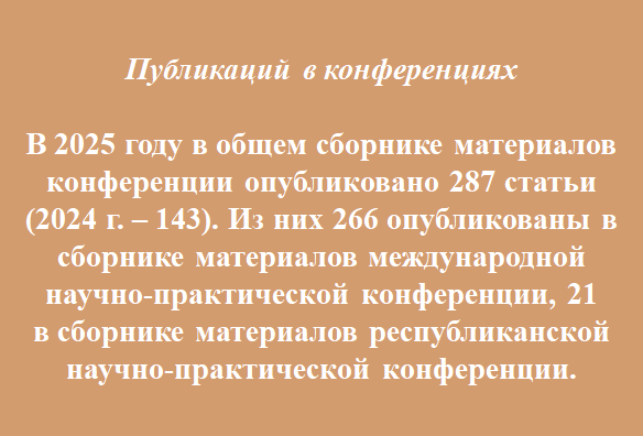 - Проведение международных, республиканских, региональных научно-практических конференций и публикация материалов.