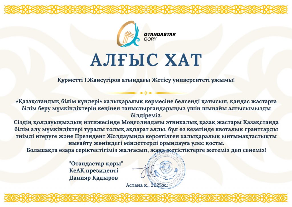 «BILIMDI EL-2022» II Халықаралық көрмесіне белсенді қатыса отырып, ынтымақтастық пен әріптестікті дамытуға қосқан үлесі үшін алғыс хаты