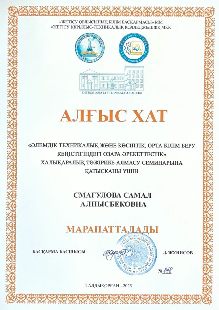"ӘЛЕМДІК ТЕХНИКАЛЫҚ ЖӘНЕ КӘСІПТІК, ОРТА БІЛІМ БЕРУ КЕҢІСТІГІНДЕГІ ӨЗАРА ӘРЕКЕТТЕСТІК" ХАЛЫҚАРАЛЫҚ ТӘЖІРИБЕ АЛМАСУ СЕМИНАРЫ