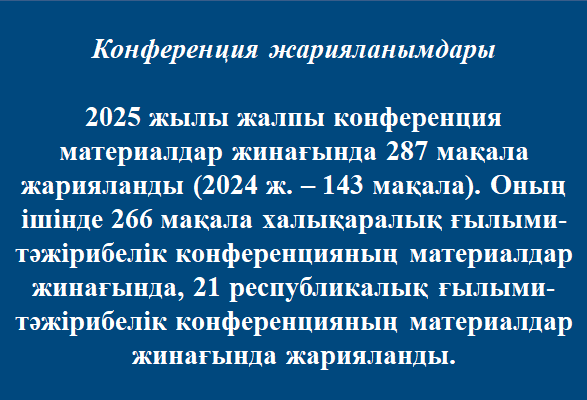- Халықаралық, республикалық, өңірлік ғылыми-практикалық конференциялар өткізу және материалдарды жариялау.