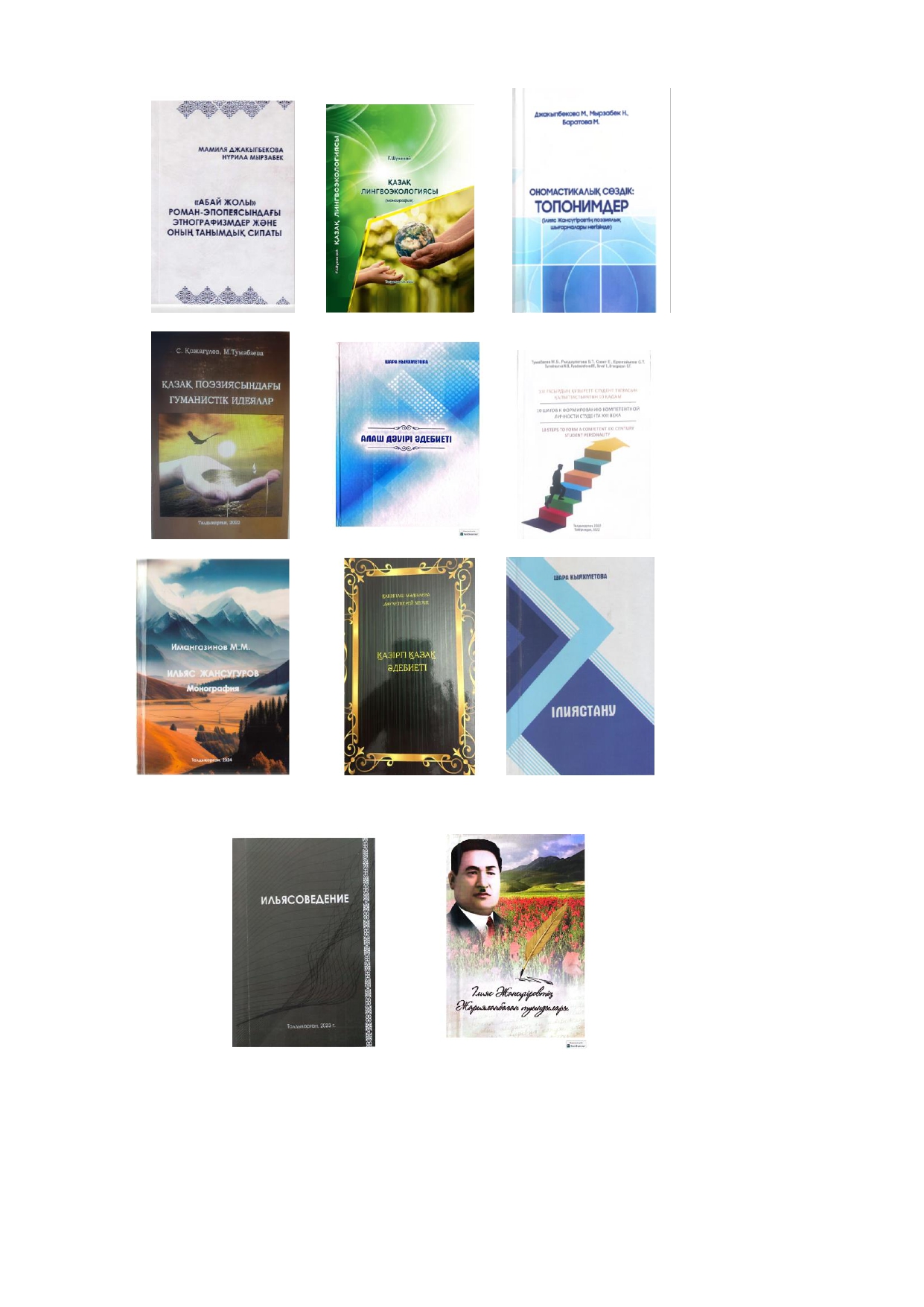 1 | Чукенаева Г.Т. Сарбасова Қ.Б. | Жетісу гидронимдері ISBN 978-601-240-205-5 | Алматы: ЭСПИ, 2020 -212 б. |