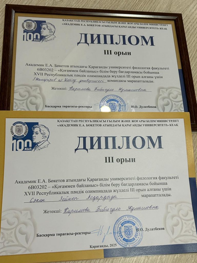 І. Жансүгіров атындағы Жетісу университеті білімгерлері Академик Е.А.Бөкетов атындағы Қарағанды университеті Филология факультетінің журналистика кафедрасы «6В03202-Қоғаммен байланыс» білім беру бағдарламасы бойынша Қазақстан Республикасының жоғары оқу орындары арасында XVII Республикалық пәндік олимпиадасында жүлделі III орын иеленді. Сонымен қатар білім жарысында бақ сынаған білімгеріміз Сәкен Зейнеп III орынмен марапатталды.