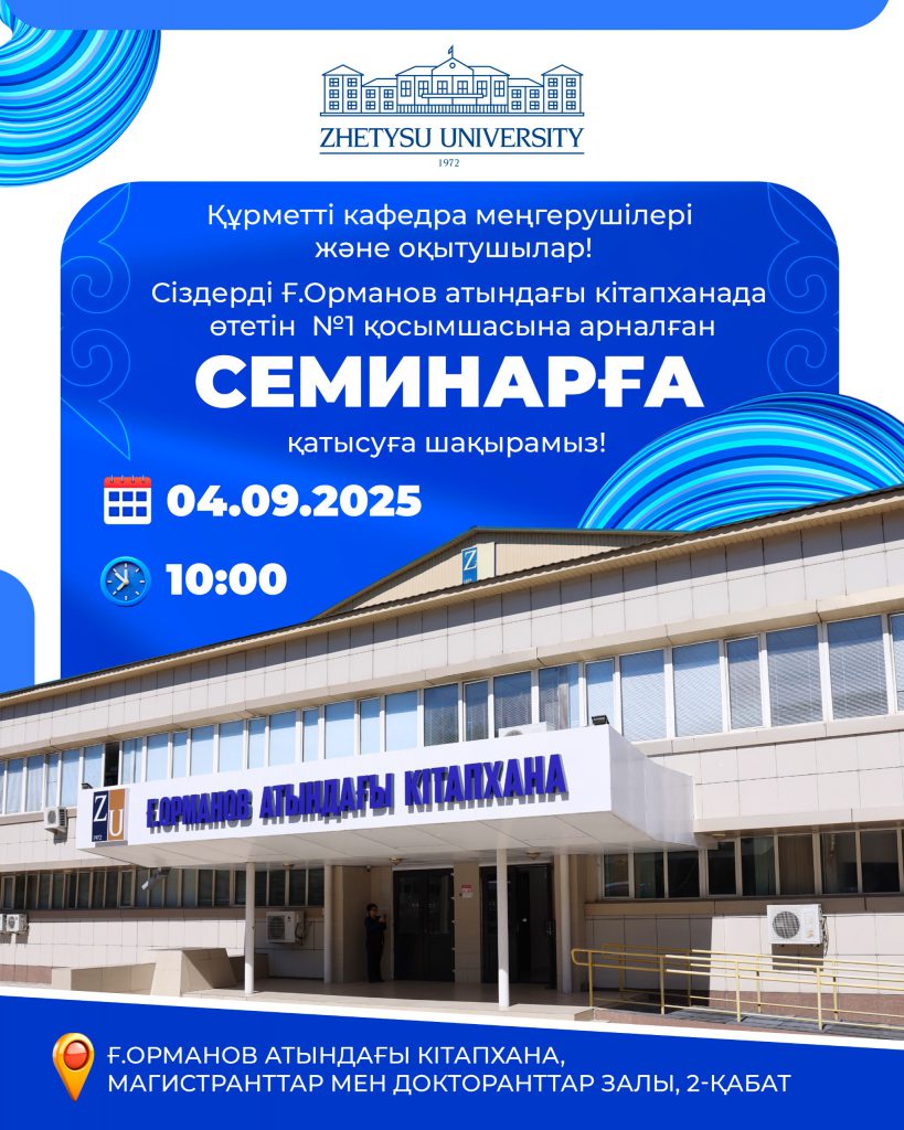 Место проведения: библиотека им. Г.Орманова, зал магистрантов и докторантов, 2 этаж.