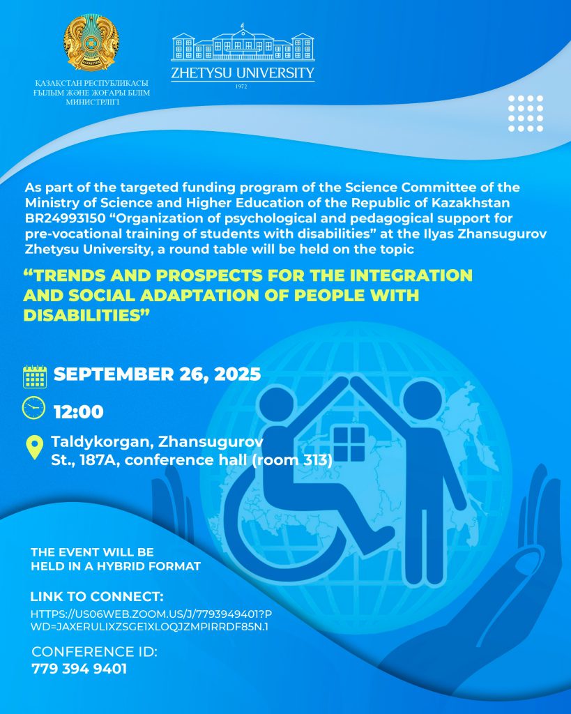 As part of the targeted funding program of the Science Committee of the Ministry of Science and Higher Education of the Republic of Kazakhstan BR24993150 “Organization of psychological and pedagogical support for pre-vocational training of students with disabilities” at the Ilyas Zhansugurov Zhetysu University, a round table will be held on the topic “TRENDS AND PROSPECTS FOR THE INTEGRATION AND SOCIAL ADAPTATION OF PEOPLE WITH DISABILITIES”.