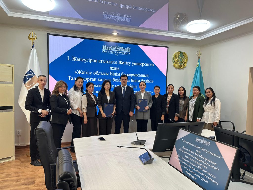 On September 30, 2025, a Memorandum of Cooperation was signed between Zhetysu University named after I. Zhansugurov and the municipal state institution “Secondary School-Gymnasium No. 10 named after Sh. Ualikhanov” of the state institution “Department of Education for the city of Taldykorgan under the Department of Education of Zhetysu oblast”. The event was attended by the Member of the Board – Vice-Rector for Academic Affairs, Doctor of Philosophy (PhD), Associate Professor B. Taubayev, Dean of the Faculty of Humanities R. Zheldibayeva, tutors of the Department of History and Social-Humanitarian Disciplines, as well as students.