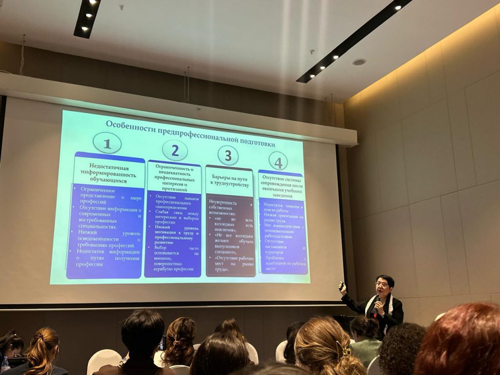 Professor Movkebayeva presented the results of a scientific study and the practical outcomes of a program funded by the Committee of Science of the Ministry of Science and Higher Education of the Republic of Kazakhstan under the project “BR24993150 — Organization of Psychological and Pedagogical Support for Pre-Professional Training of Students with Disabilities.” Her report, titled “From School to Profession: Pre-Professional Strategies for Children with Disabilities,” drew particular interest and engagement from the participants.