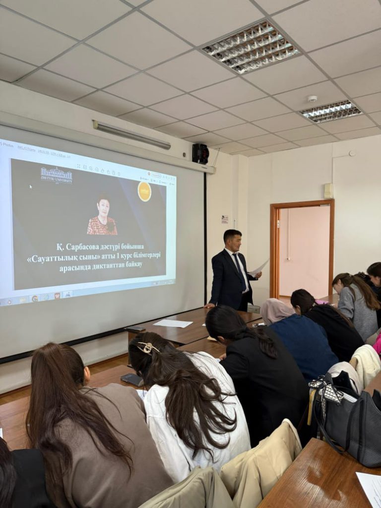 В рамках программы был проведён ежегодный диктант «Сауаттылық сыны» среди студентов 1-курса образовательной программы «Казахский язык и литература». Инициатором этого диктанта когда-то стала доцент, кандидат филологических наук К. Сарбасова – ветеран кафедры, посвятившая многие годы развитию грамотности и языковой культуры студентов. Сегодня начатое ею дело превратилось в добрую кафедральную традицию, которую продолжают с благодарной памятью о её труде.