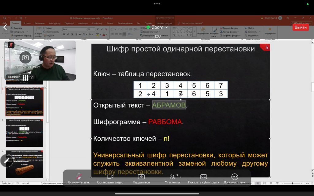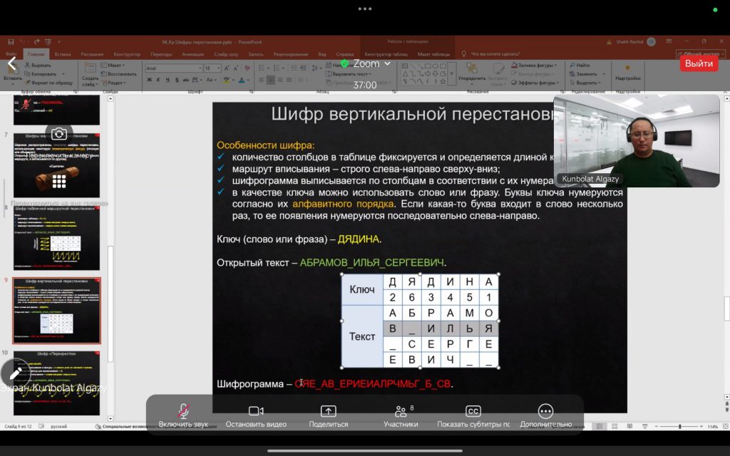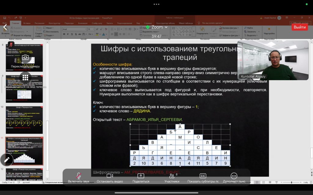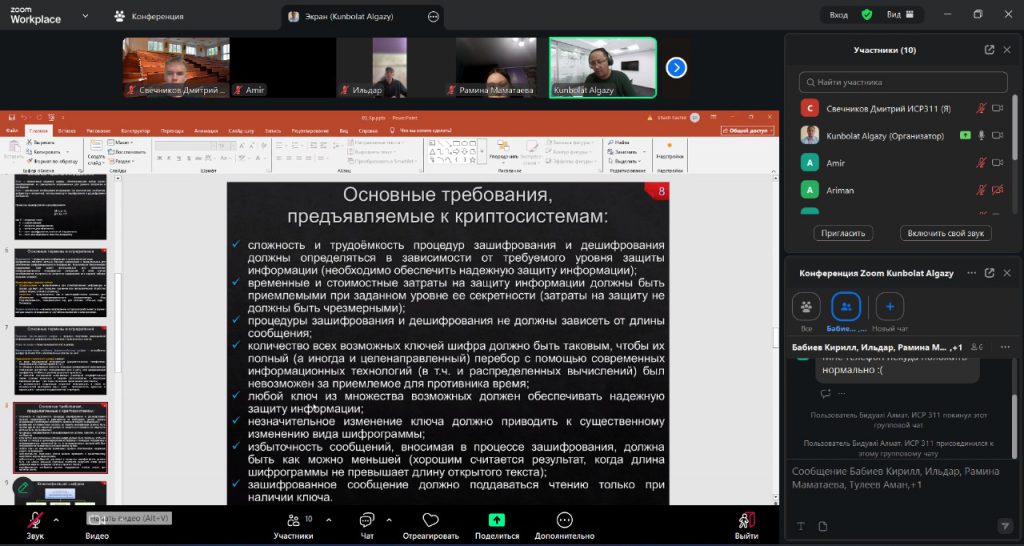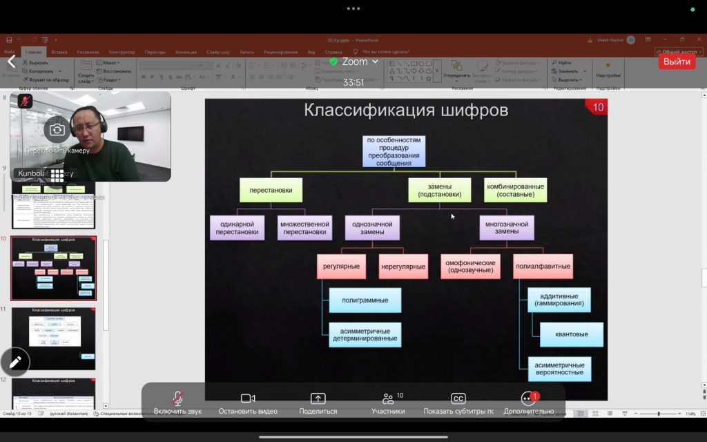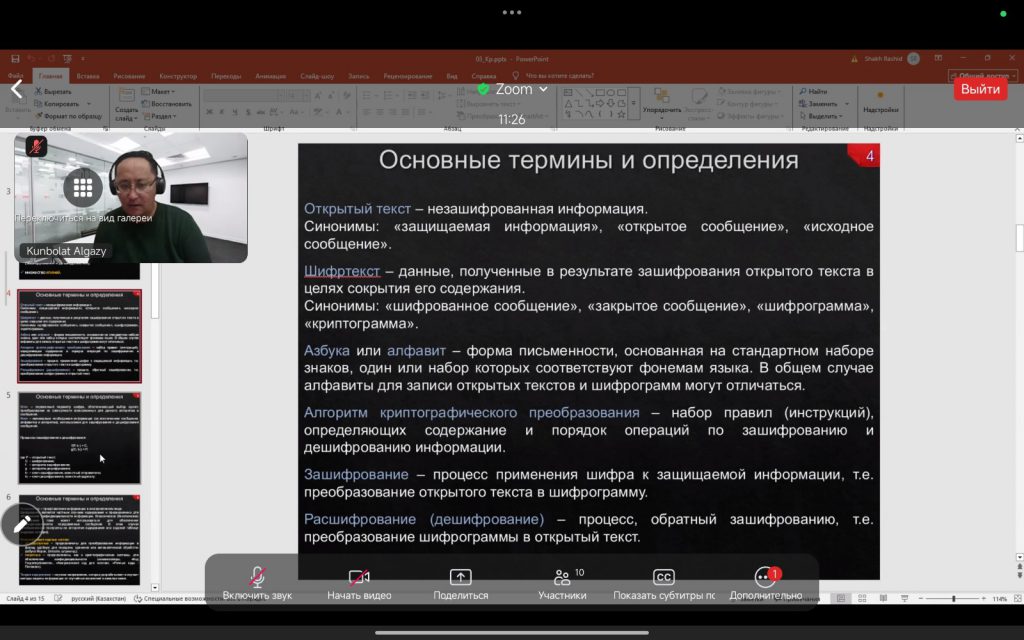 Қауымдастырылған профессор, PhD Алғазы Күнболат Тілеуханұлы 6В06102 – Ақпараттық жүйелер бакалавр студенттеріне “Инновационные технологии защиты цифровой информации” пәні бойынша дәріс оқып, зертханалық жұмыстар жүргізді.