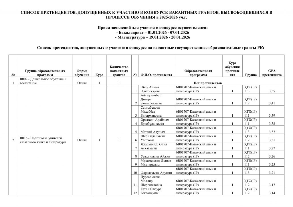 СПИСОК ПРЕТЕНДЕНТОВ, ДОПУЩЕННЫХ К УЧАСТИЮ В КОНКУРСЕ ВАКАНТНЫХ ГРАНТОВ, ВЫСВОБОДИВШИХСЯ В ПРОЦЕССЕ ОБУЧЕНИЯ в 2025-2026 уч.г.Новости #SDG #ЦУР #ТДМ