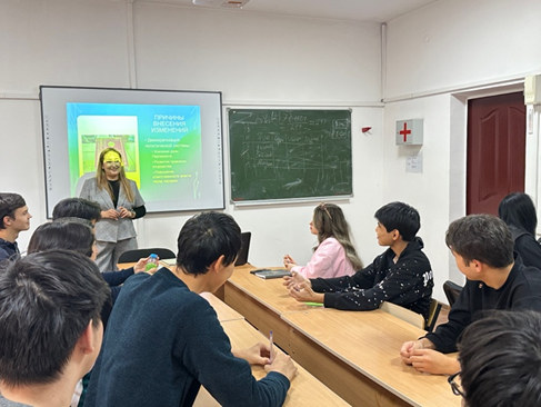 The curator — Rima Yergaliyevna Abdualiyeva — introduced students to the key updates of the country’s Basic Law and discussed their importance for the development of a democratic society, strengthening the protection of citizens’ rights, and improving the system of public administration.