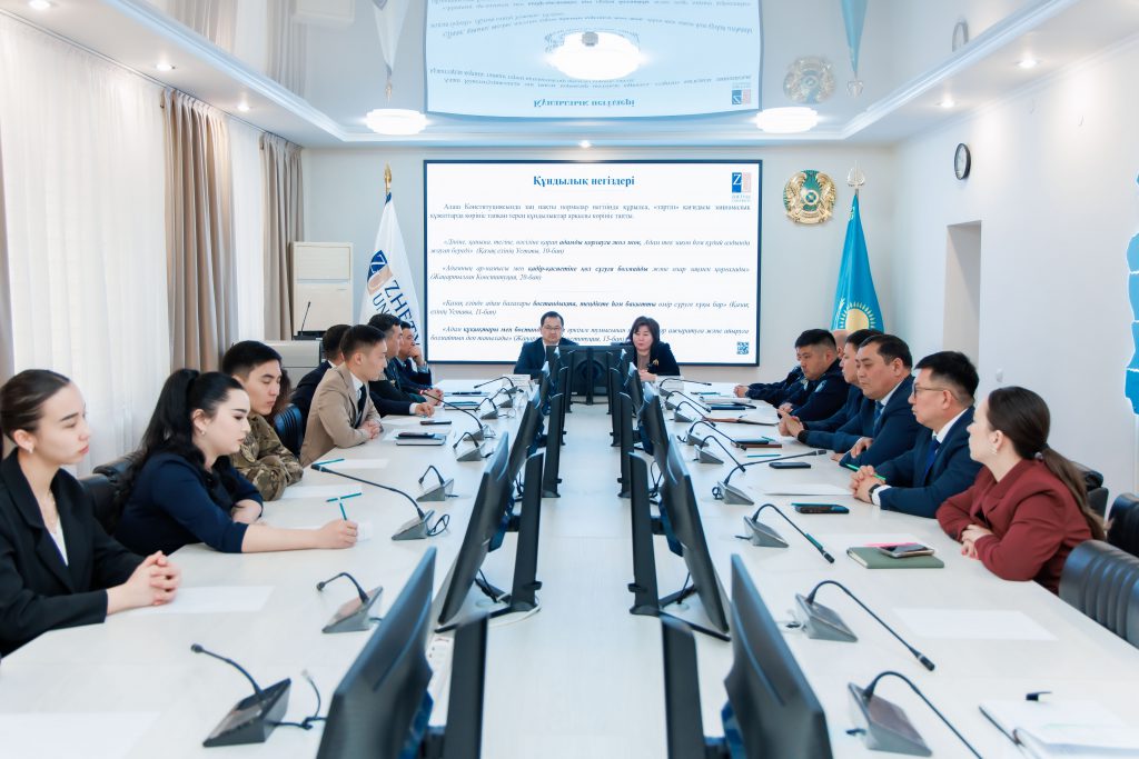 The meeting was moderated by the Rector of the university, Yermek Buribayev, who emphasized that the ideology of law and order serves as a key guarantee for the sustainable development of society. He noted that the Constitution is the fundamental document of the state, clearly defining citizens’ rights and freedoms as well as the principles of justice and public order within society. The Rector also highlighted that such meetings help enhance students’ legal awareness and foster a responsible attitude toward the future of the country.