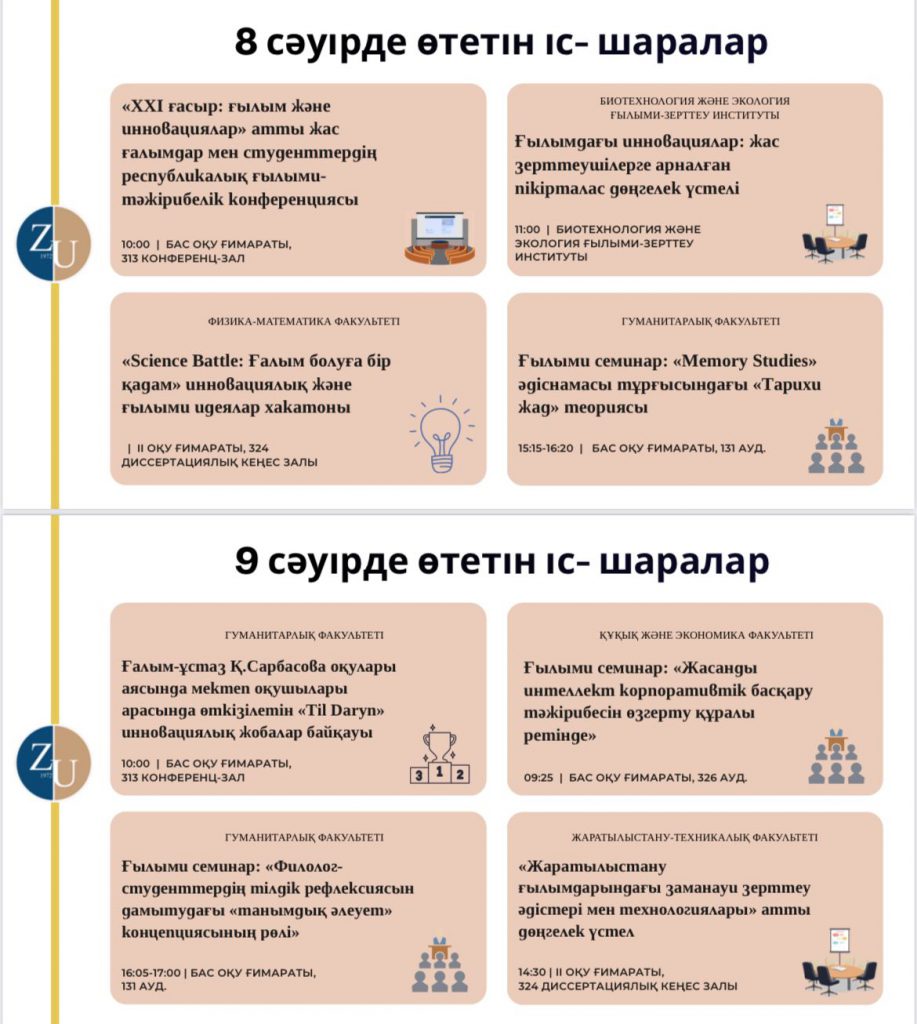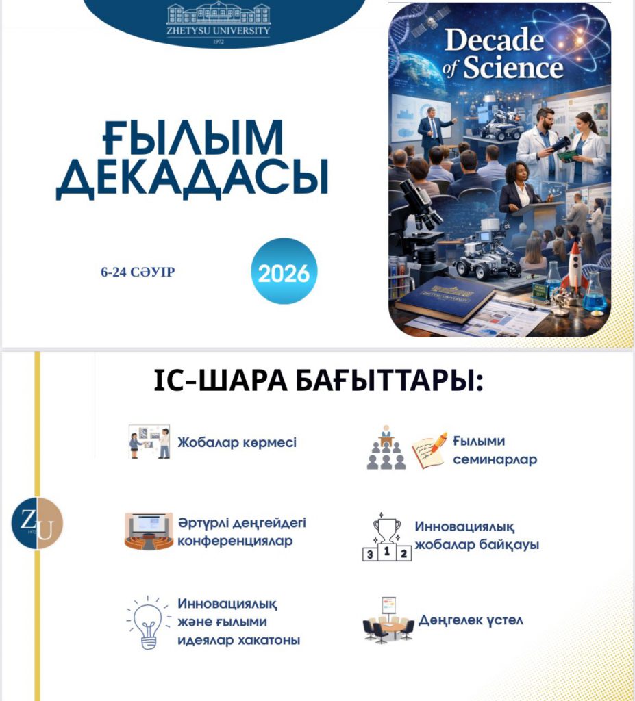 📢 В период с 6 по 24 апреля 2026 года в Университете Жетысу имени И. Жансугурова пройдет Декада науки – 2026, в рамках которой будут проводиться мероприятия, направленные на повышение интереса к науке и образованию, презентацию новых исследований и развитие потенциала молодых ученых.