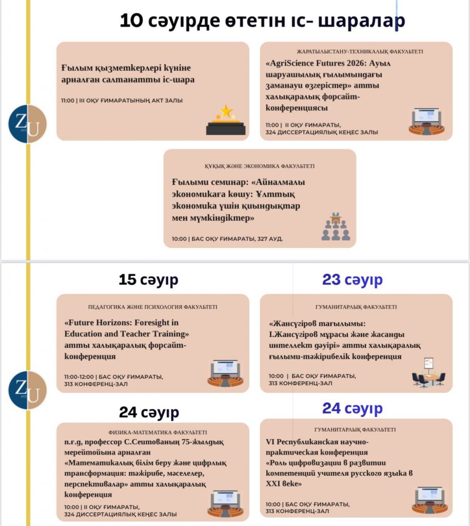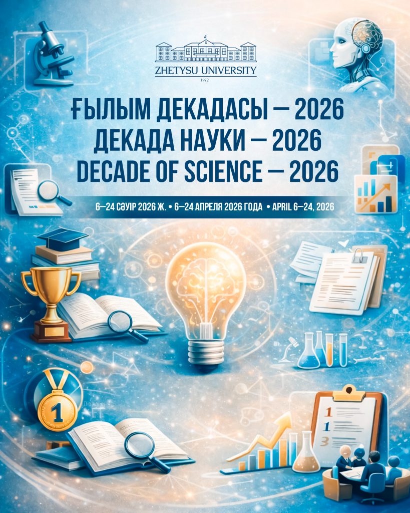 📅 2026 жылдың 6-24 сәуір аралығында І. Жансүгіров атындағы Жетісу университетінде Ғылым декадасы – 2026 аясында  ғылым мен білімге қызығушылықты арттыруға, жаңа зерттеулерді таныстыруға және жас ғалымдардың әлеуетін дамытуға арналған іс-шаралар өтеді.