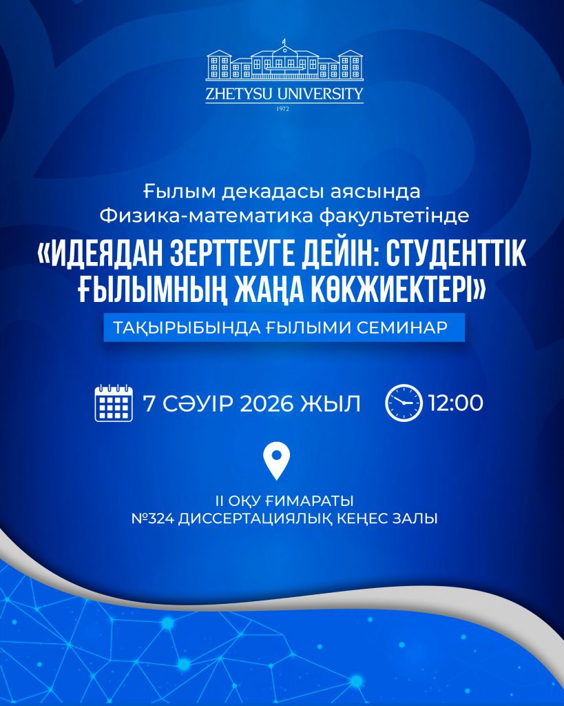 Ғылым декадасы аясында Физика-математика факультетінде 2026 жылғы 7 сәуір күні сағат 12:00-де, №324 диссертациялық кеңес залында «Идеядан зерттеуге дейін: студенттік ғылымның жаңа көкжиектері» тақырыбында ғылыми семинар өтеді.