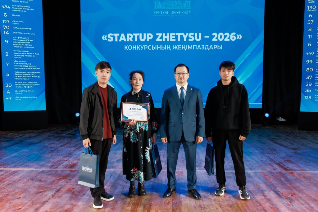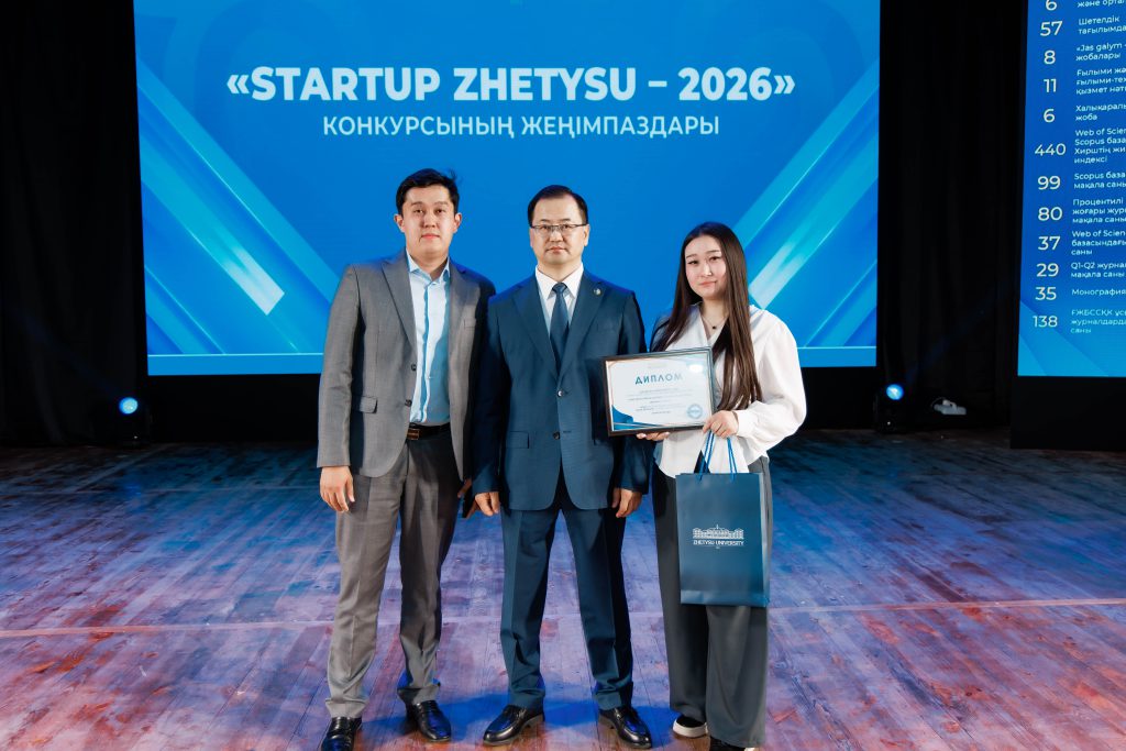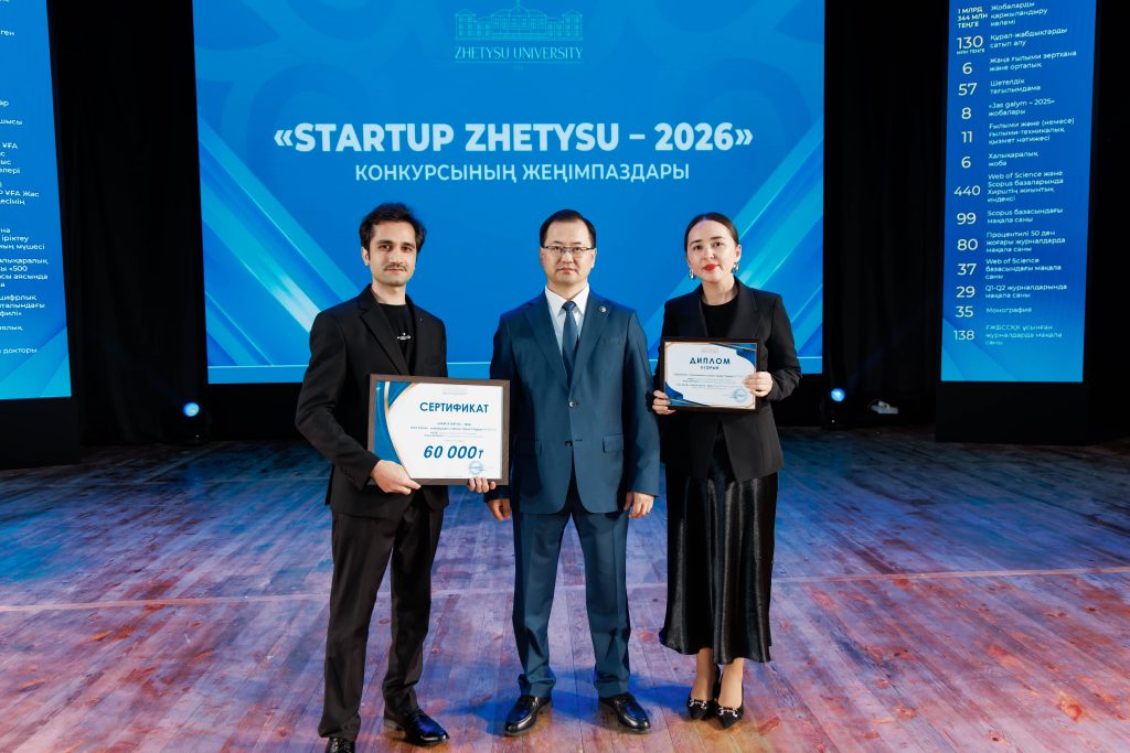 Победителям конкурса инновационных проектов «Startup Zhetysu – 2026» вручены дипломы и сертификаты на суммы 130, 120, 90 и 60 тысяч тенге. Лучшими признаны проекты: «TravelApp» (Гран-при), «BasQAN» (I место), мобильное приложение для изучения языка Python (I место), Zhetysu Science Hub (I место), «Smart Tamshy» (II место), EcoBox (II место), Zhetysu Sky (II место), OnoMap Ilyas (III место), Ready4AI (III место), «Fast Future» (III место), Tildy (III место).