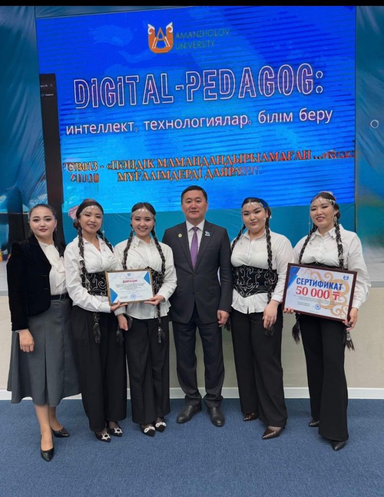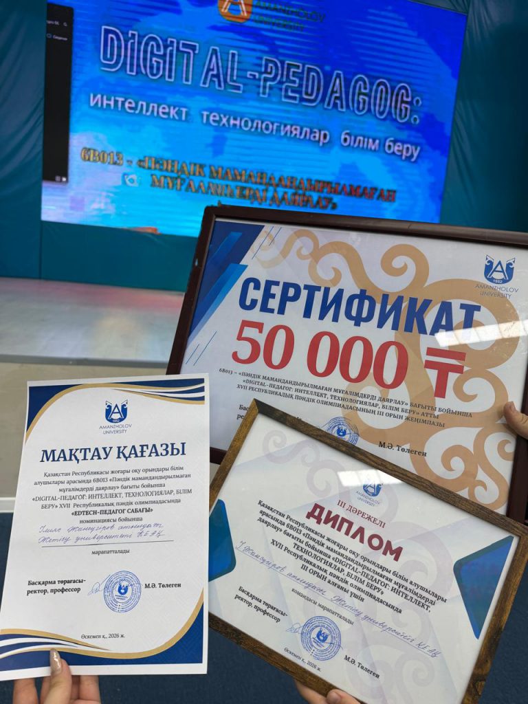 По итогам конкурсных испытаний команда продемонстрировала высокий уровень теоретической подготовки, сформированность педагогических и цифровых компетенций, а также способность к решению профессионально-ориентированных задач, заняв III место в XVII Республиканской предметной олимпиаде.
