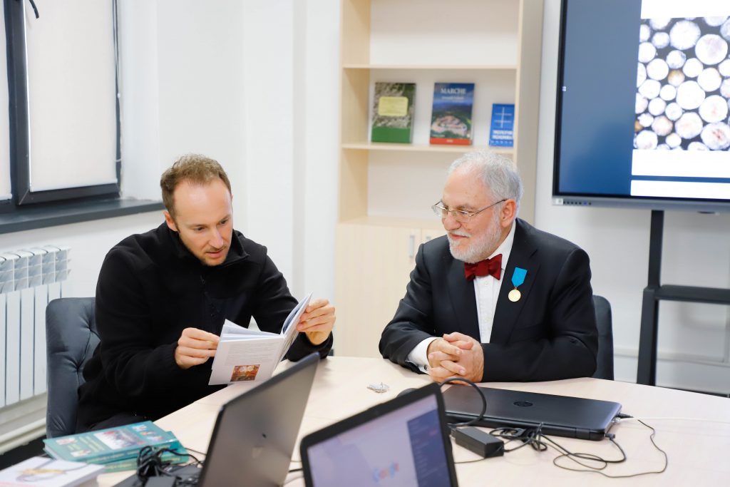 Роберто Болтридың іссапары Жетісу университеті базасында орналасқан Марке политехникалық университетінде жалғасын тапты. Қадірлі қонақ “Агрономия” қос дипломды бағдарламасының студенттерімен және шақырылған италияндық оқытушы Марко Фиорентинимен кездесіп, екі ел арасындағы мәдени байланыстың, білім берудің пайдасы мен маңыздылығын талқылады. Сөз соңында Болтри мырза Экология кафедрасының меңгерушісі проф. Ж.Ж. Қанағатовқа экология тақырыбына байланысты өзінің авторлық кітаптарын сыйға беріп, олар филиал офисының сөрелерінде орын тапты.
