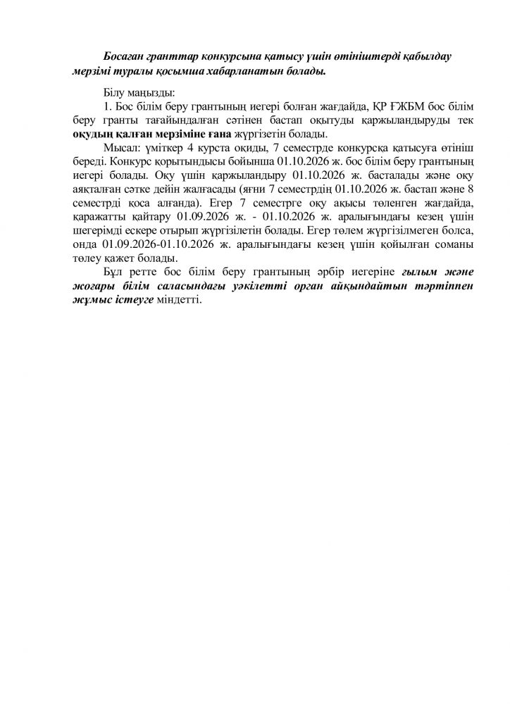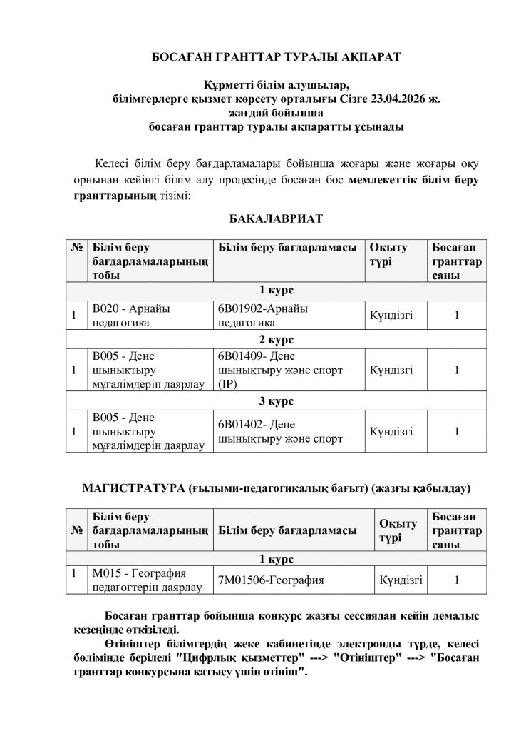 БІЛІМ АЛУ ПРОЦЕСІНДЕ БОСАҒАН БОС БІЛІМ БЕРУ ГРАНТТАРЫ