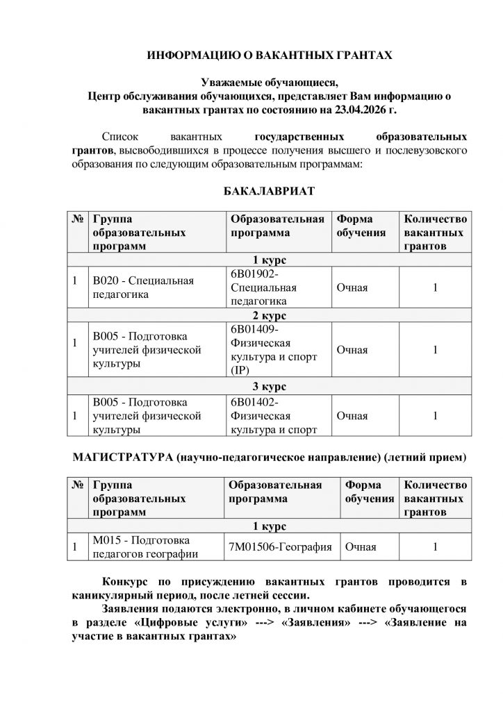 ВАКАНТНЫЕ ОБРАЗОВАТЕЛЬНЫЕ ГРАНТЫ, ВЫСВОБОДИВШИЕСЯ В ПРОЦЕССЕ ПОЛУЧЕНИЯ ОБРАЗОВАНИЯНовости #SDG #ЦУР #ТДМ