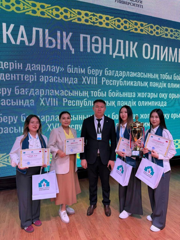 From April 23 to 24, 2026, the XVII Republican subject Olympiad on the educational program “6b013-training of biology teachers” was held on the basis of the International Kazakh – Turkish university named after Khoja Ahmed Yasawi. Students of the WK–311 group of the educational program “6b01508 – Biology” of the natural and technical faculty took part in this educational competition and showed high results. Participants of the Olympiad: Rysbek Akbota Kanatbekovna, Orazalinova Fariza Ergazyevna, Imanalievna Ziada. The scientific supervisor is the head of the Department of Natural Sciences, PhD doctor Mukasheva Danagul Madiyarov. Students proved their professional competence at a high level in the competition, which consisted of theoretical and practical stages, as a result of which they took the first place in the team competition. We wish the winning students and the supervisor creative success, new scientific achievements.