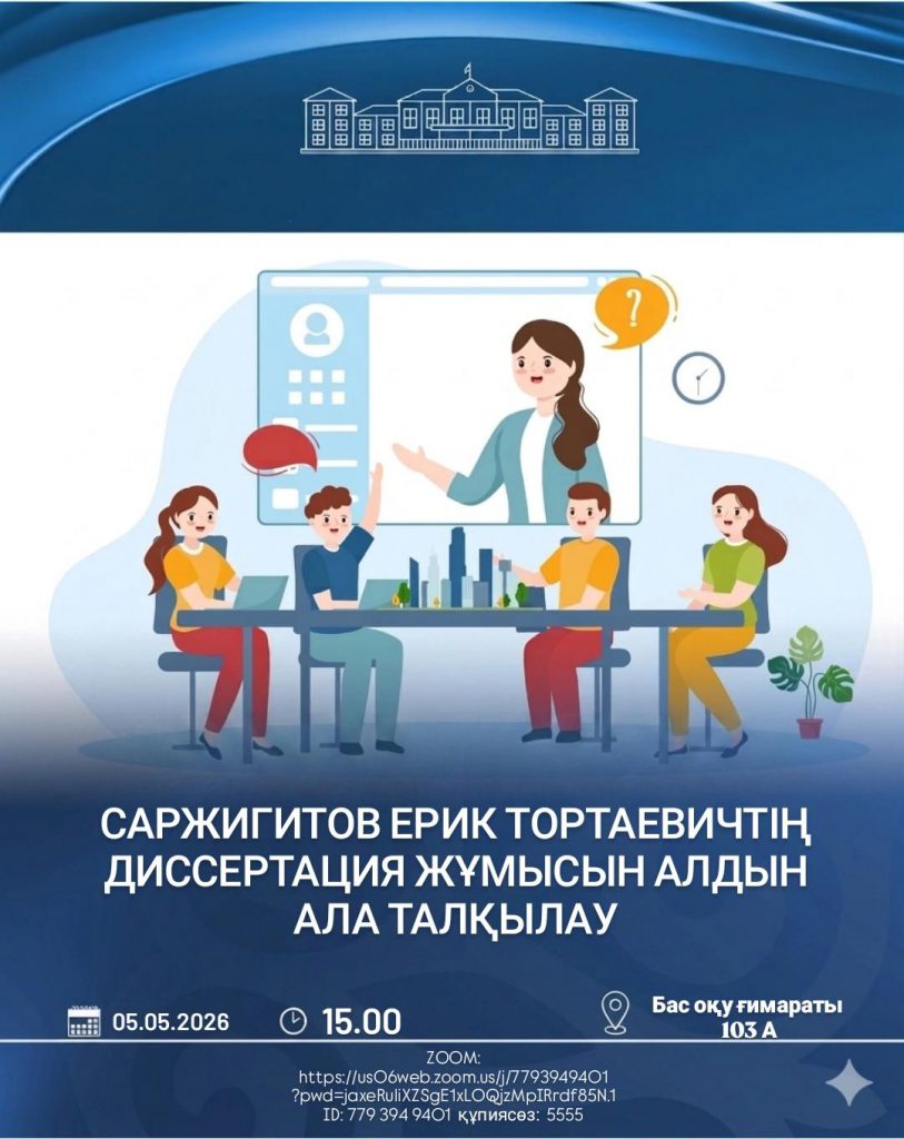 2026 жылғы 5 мамыр күні «6D011700 – Қазақ тілі мен әдебиеті» білім беру бағдарламасының докторанты Саржигитов Ерик Тортаевичтің филоософия докторы дәрежесіне іздену мақсатында «Жыраулар поэзиясын жоғары оқу орнында оқыту әдістемесі» тақырыбы бойынша диссертация жұмысын алдын ала талқылау өтеді.