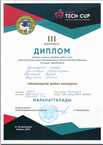 Инженерлік жоба номинациясы бойынша біздің ММА командасына үшінші дәрежелі диплом табыс етілді, сондай-ақ “Satbayev University” техникалық университетінде гранттық оқуға сертификаттар табысталды. Команда барлау және іздеу жұмыстарына арналған “Scout” робот жобасын ұсынды.