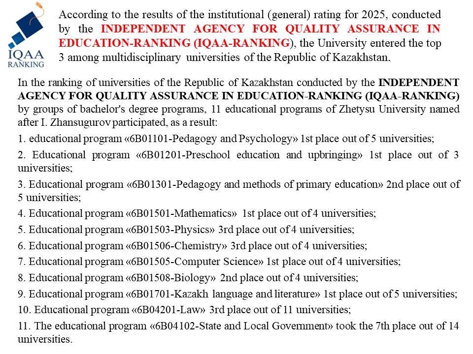 | 6B01501 Mathematics | Zhetysu University named after Ilyas Zhansugurov | Multi-profile | Zhetysu Region | 9 / 25 |