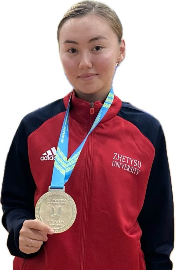 Студентка 3 курса факультета физической культуры и искусство. Чемпион XII-Летней Универсиады cреди вузов РК по легкой атлетике и метанию копья.